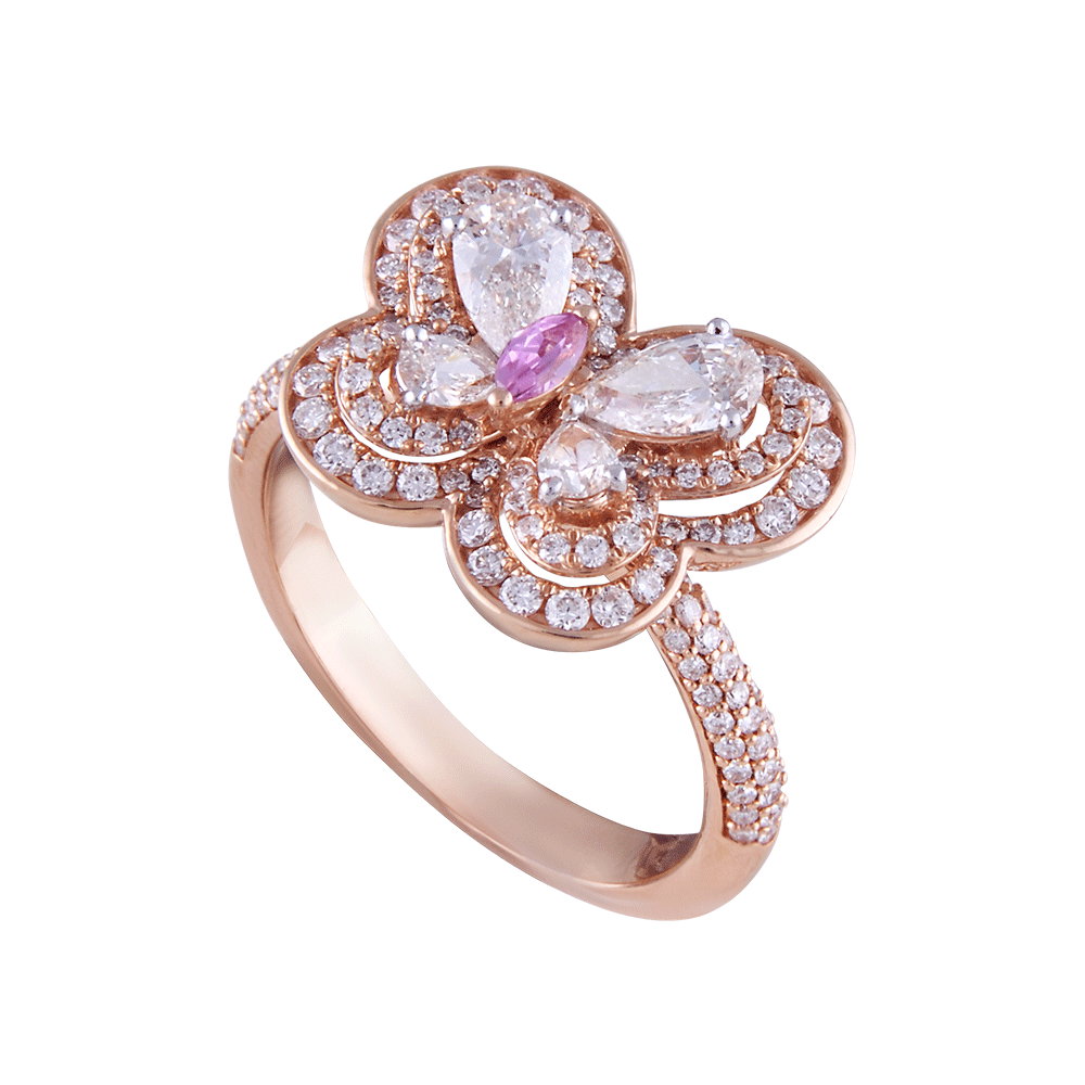 This sparkling Butterfly ring is definitely a conversation starter. Carved in 18 karat Rose Gold and studded with Pear, round-shaped Diamonds and Pink Sapphires, this enticing ring can be best adorned with your glitzy evening ensemble.