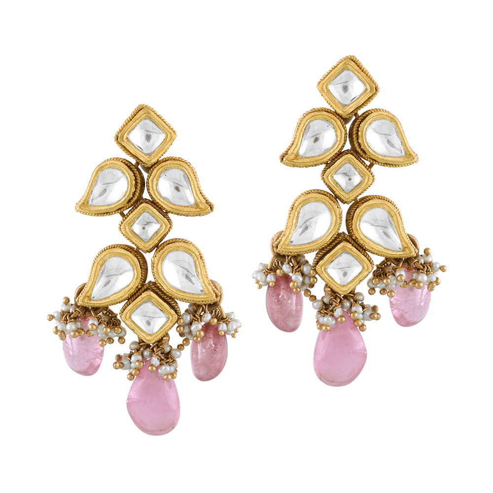 Elegant and gracious! This exquisite pair of Jatdar earrings from our exclusive Aarhana collection is crafted with 22 karat Gold and cascading Pink Sapphires, that exudes pure magnificence.