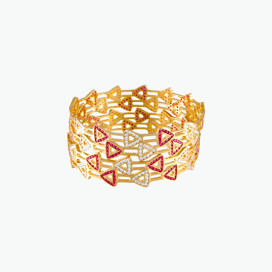 Amp up your ethnic ensemble with these pristine bangles embellished with 22 karat Yellow Gold studded with chanel set American Diamonds and be the show stealer of the day.